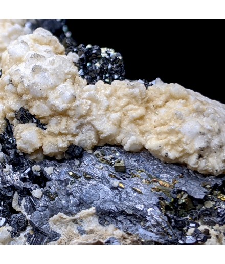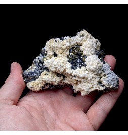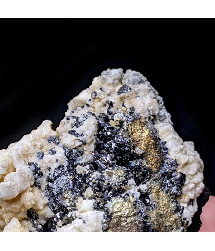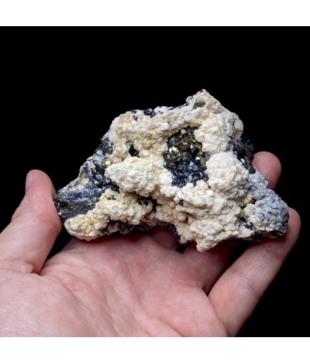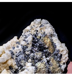 Typical piece of its deposit, associating rhodochrosite white, sphalerite and pyrite.