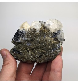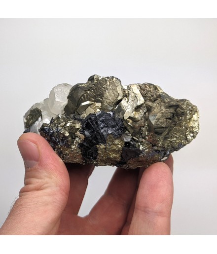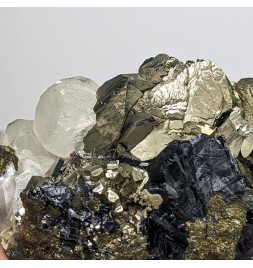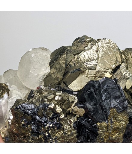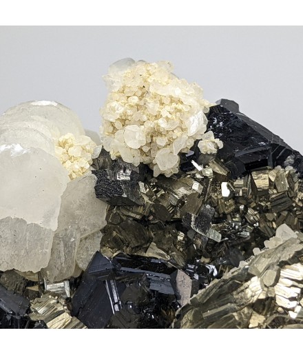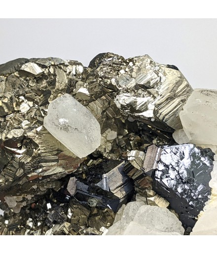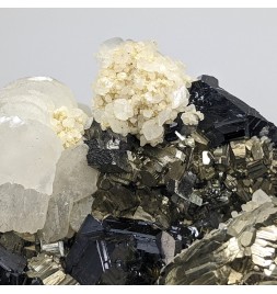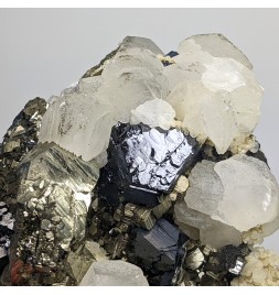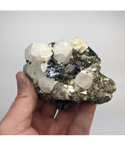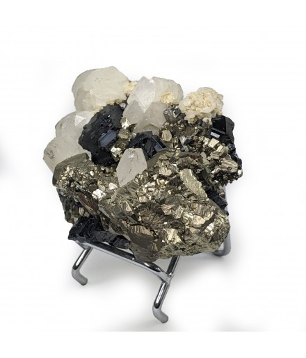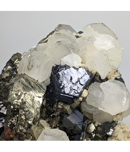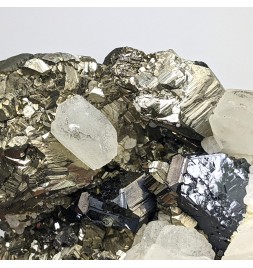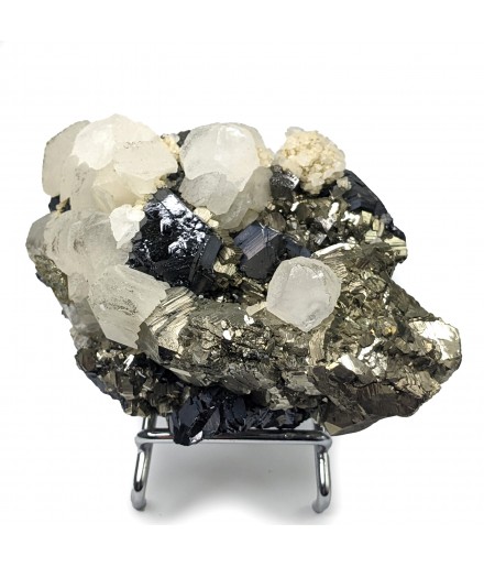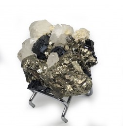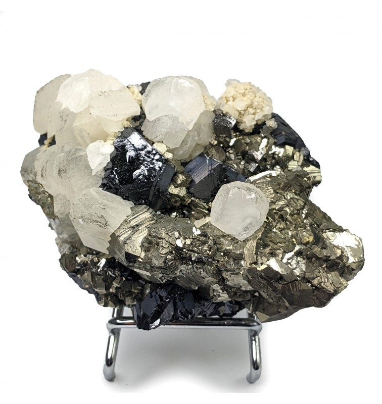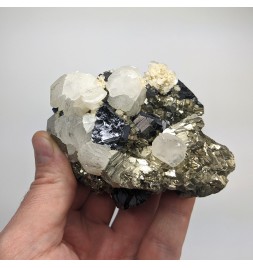 Piece consisting of a matrix of shiny pyrite covered with crystals of sphalerite, of calcite and a little bit of rhodochrosite white.