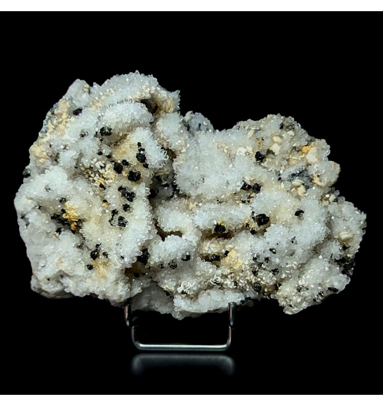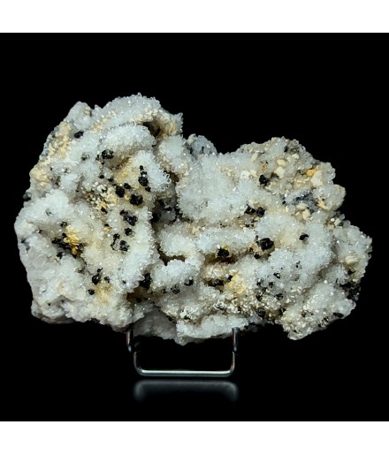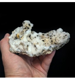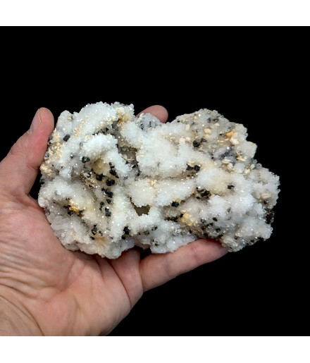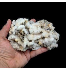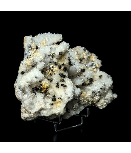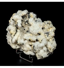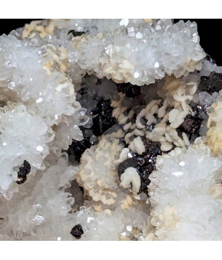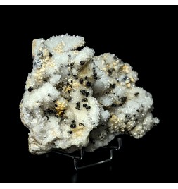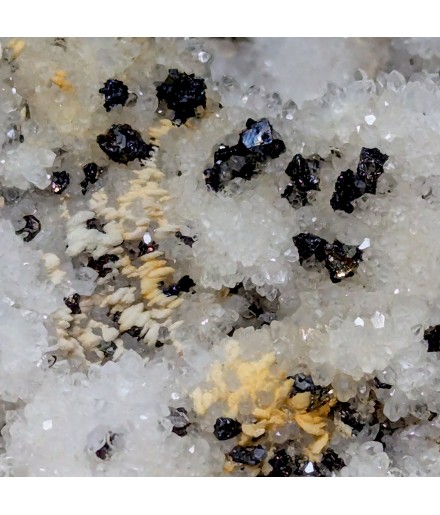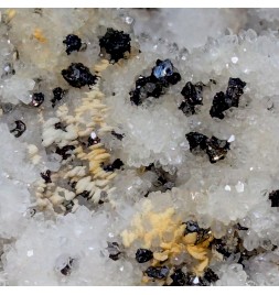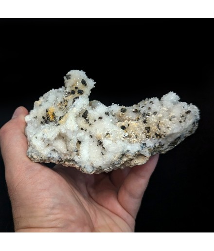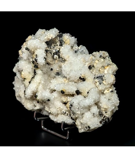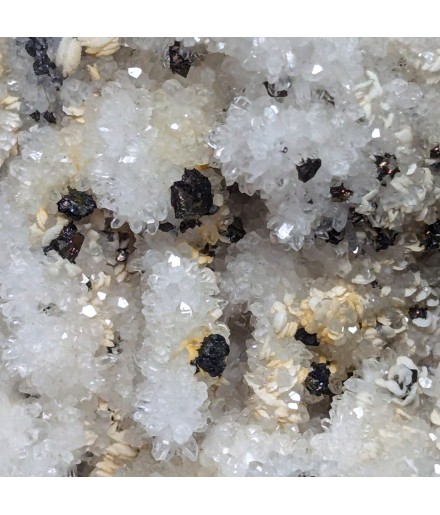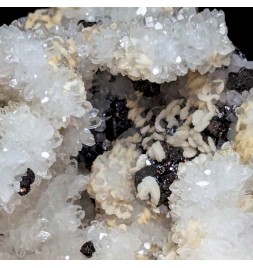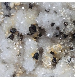 Pretty crystallization of quartz shiny white, accompanied by millimetric crystals of barite and pyrite.