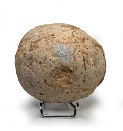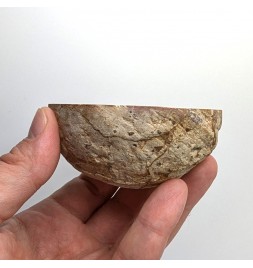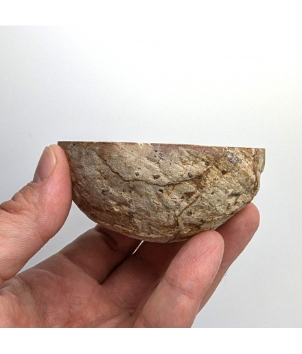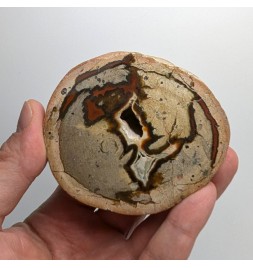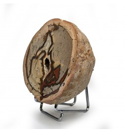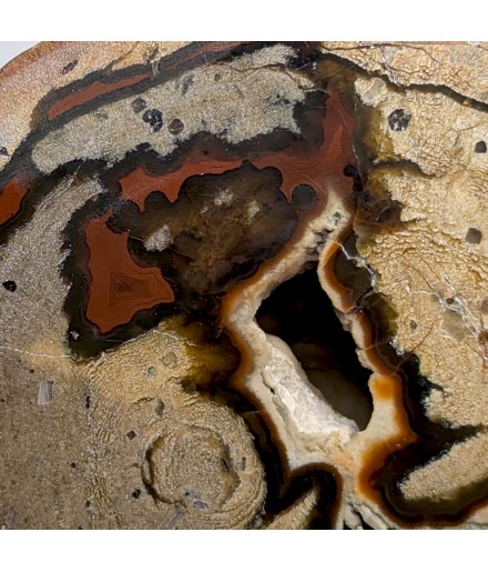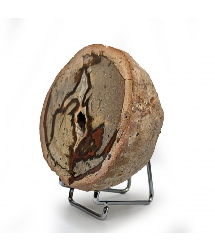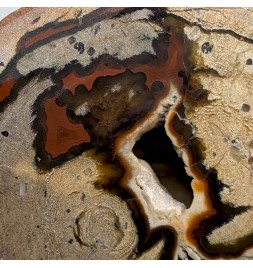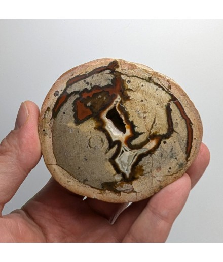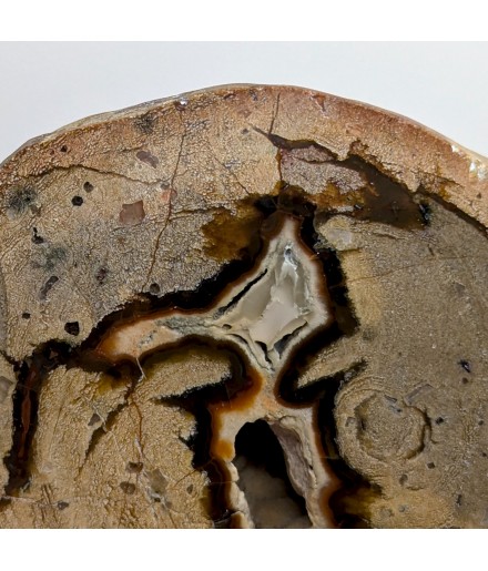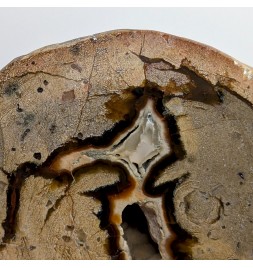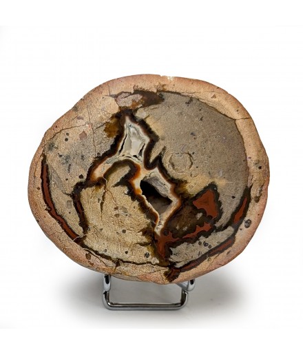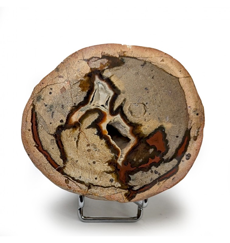 Half lithophyse polished, beige with red edging, presenting a geode in its center.
