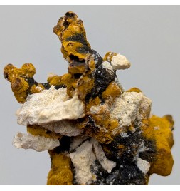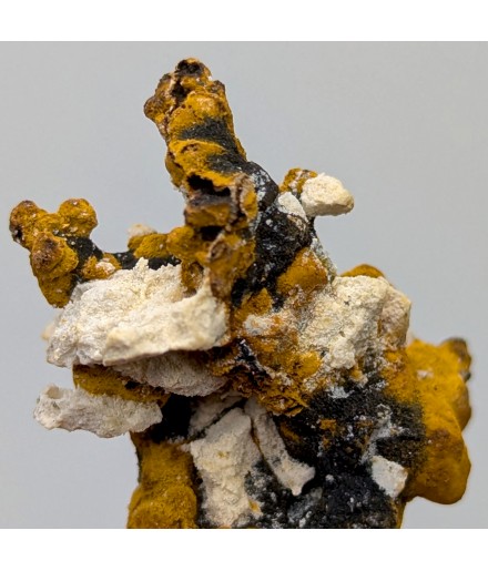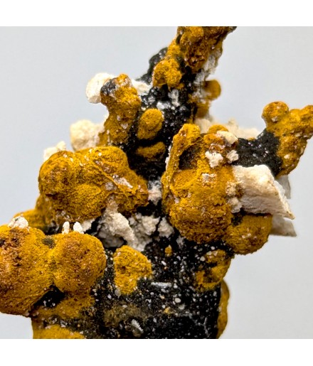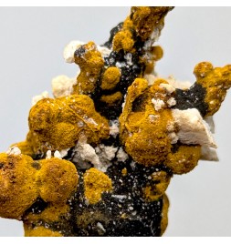 Romanéchite (barium-containing manganese oxide) black contrasted by spheres of a yellow ferric oxide, probably goethite.