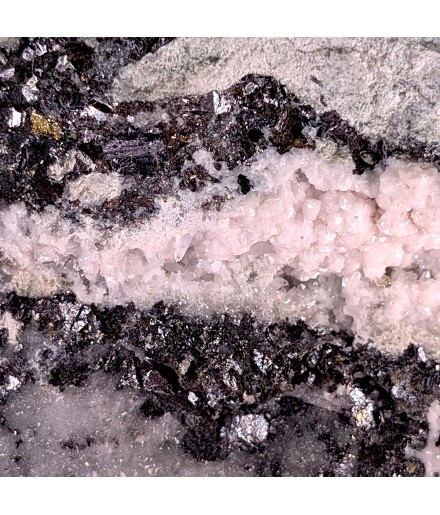 Manganocalcite with a light colour, covered with small pyrite crystals, on a gangue rich in sphalerite.