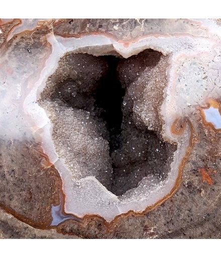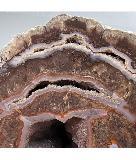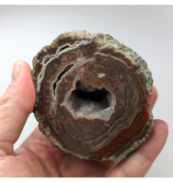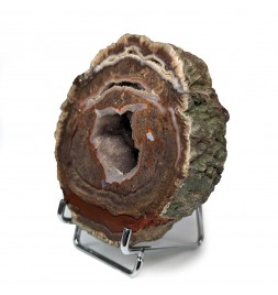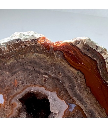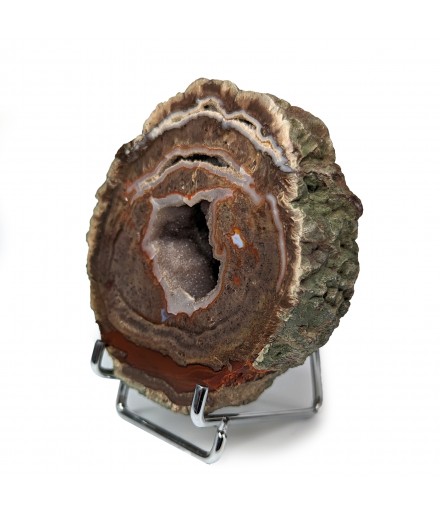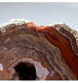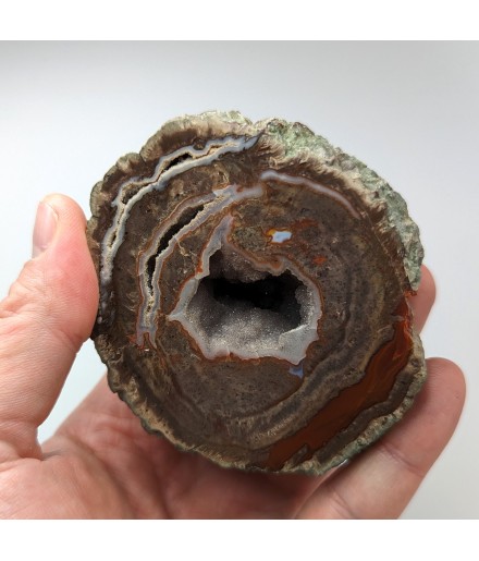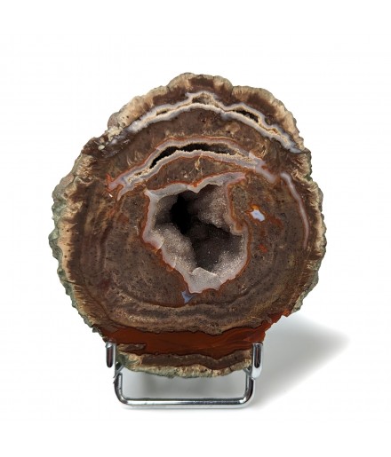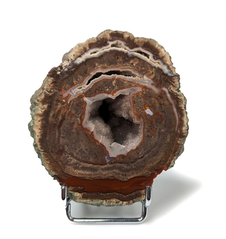 Lithophyse sawn and polished with a dominant red with a crystallized geode in its center.