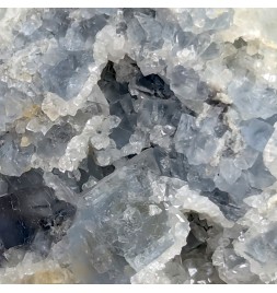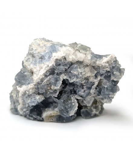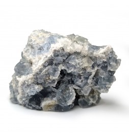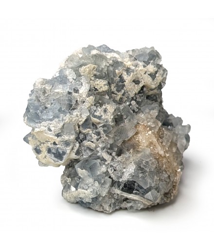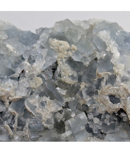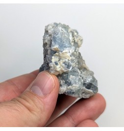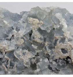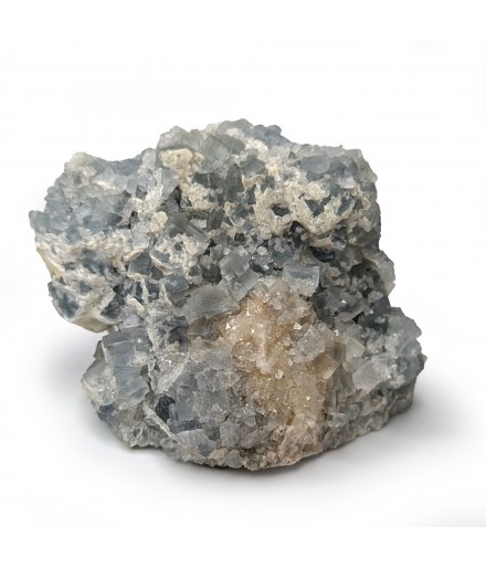 It presents a crystallization of blue cubes caught in quartz, on both sides of the piece.