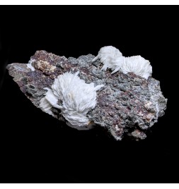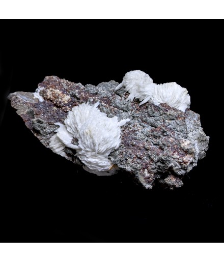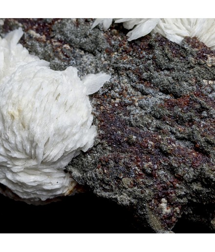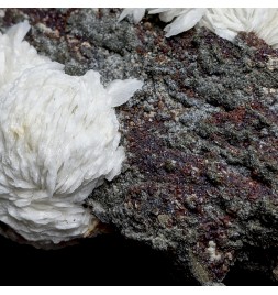 It features two groups of white crested barite pompoms on a carpet of red sphalerite.