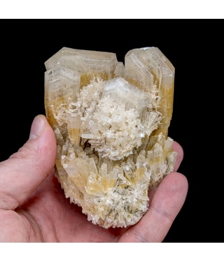 A pleasant presentation for this bicolor gypsum with two large main crystals framing increasingly smaller crystals, forming an almost cylindrical specimen.