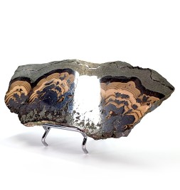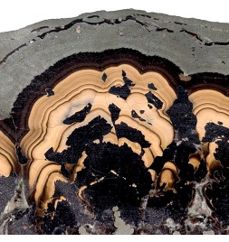 Polished slice of Schalenblende, a mix of galena, wurtzite, sphalerite, and marcasite.
