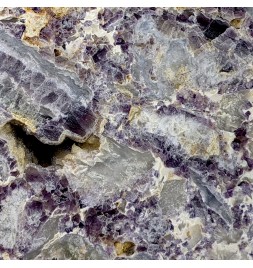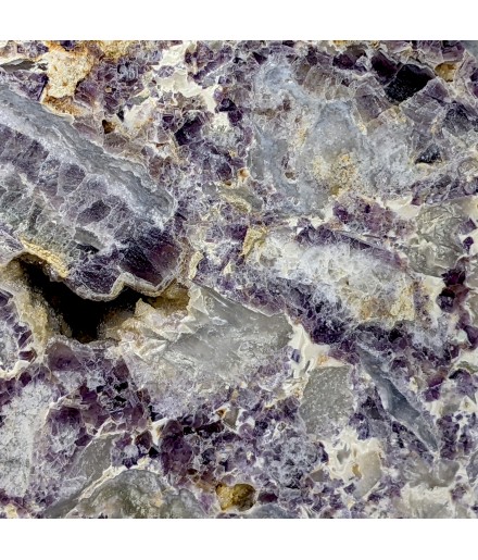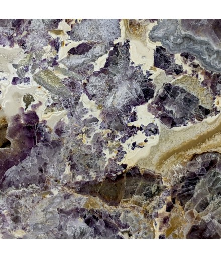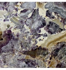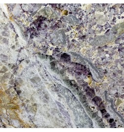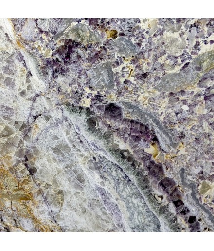 Polished slice of a mix of green, purple fluorite, kaolin and rock.