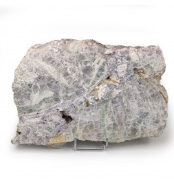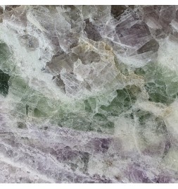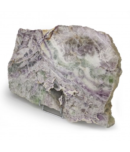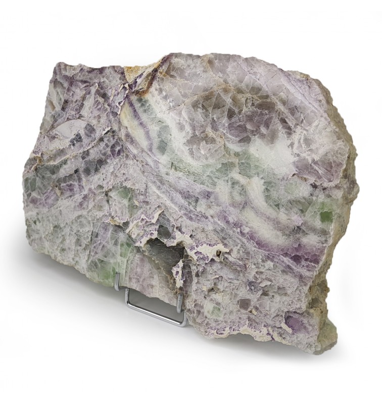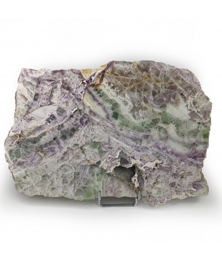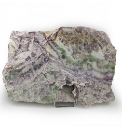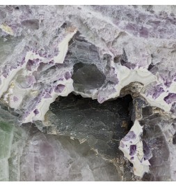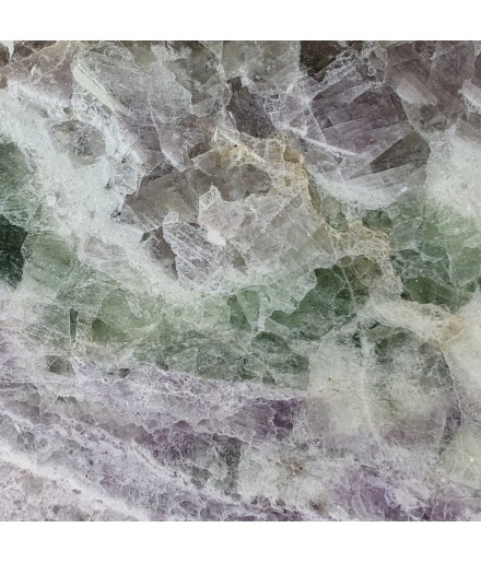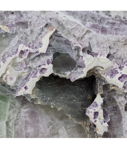 Polished slice of a mix of green, purple fluorite and kaolin. Presence of a small crystallized geode.