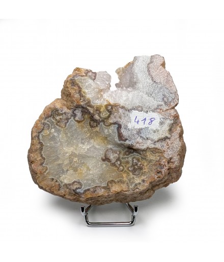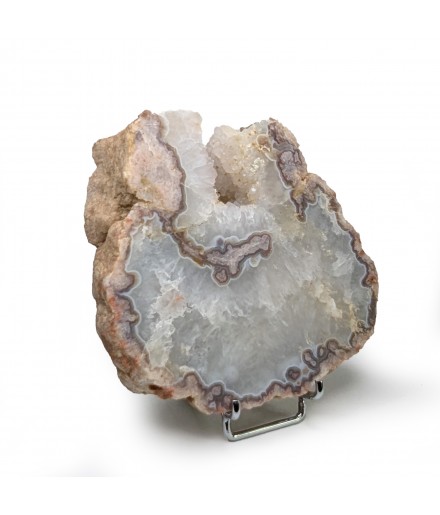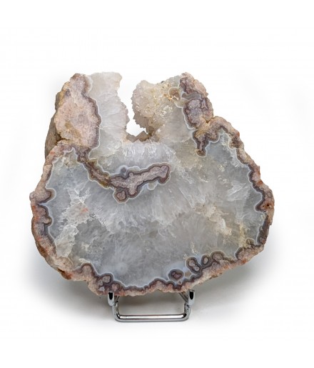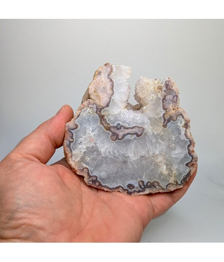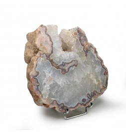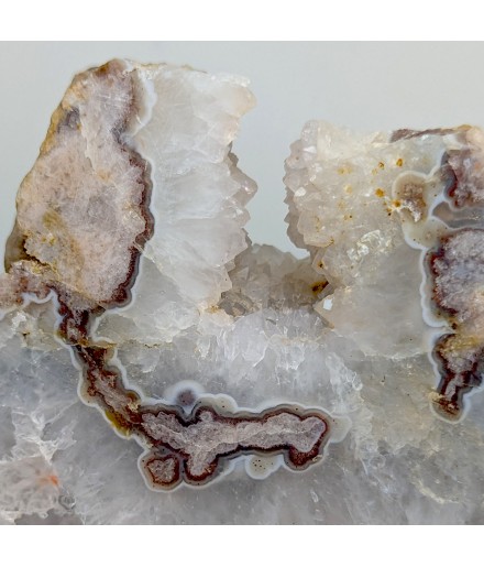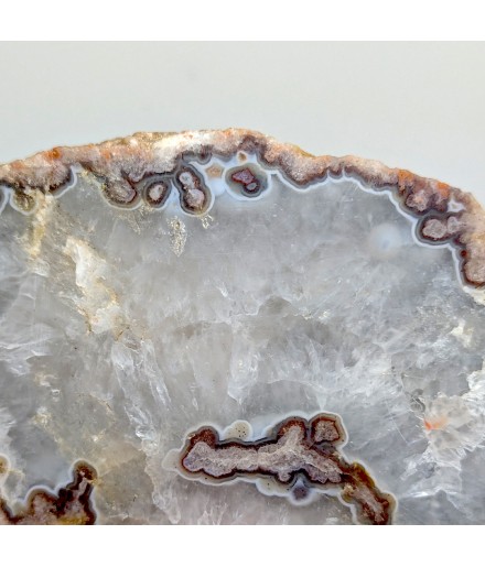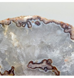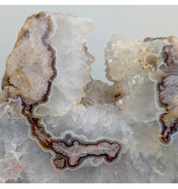 Slice of chalcedony with a heart of solid quartz and a sawn geode of crystallized quartz.