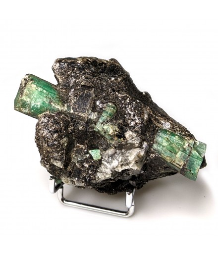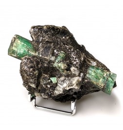 Piece featuring three main crystals ofemerald contrasted by a shiny biotite matrix.