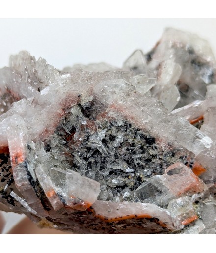 Rare calcite shiny, with inclusions of realgar forming a red border in each crystal.
