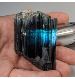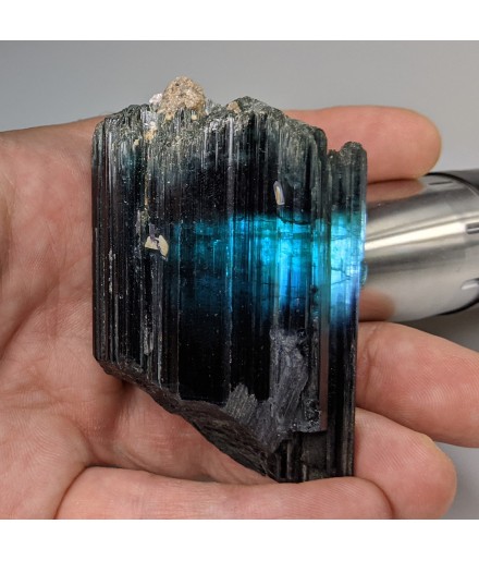 Tourmaline crystal, revealing its blue color with lighting, as well as a small purple area.
